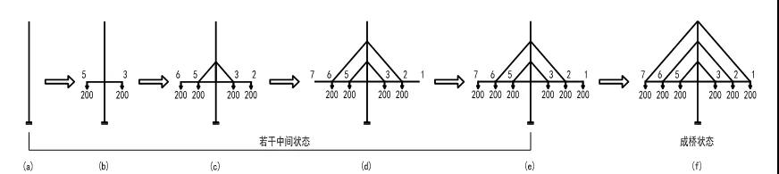 上圖是斜拉橋的安裝成形過程。根據(jù)原理一,只要在結(jié)構分析時增加構件單元無應力狀態(tài)量的條件,則結(jié)構的內(nèi)力和位移與經(jīng)歷的過程無關。只需令中間狀態(tài)結(jié)構已安裝單元的無應力狀態(tài)量與成橋狀態(tài)相等,用分階段成形結(jié)構的力學平衡方程直接求解內(nèi)力和位移,分析時荷載應采用當前狀態(tài)下已施加于結(jié)構的總荷載。用原理二中的無應力索長調(diào)整與索力變化的關系,依據(jù)結(jié)構的實際受力需要,拉索的無應力長度分次調(diào)整到位。根據(jù)原理三,只要以拉索的無應力長度差值(張拉端錨固螺母位置的移動量)代替拉索張力作為調(diào)索控制手段,則可實現(xiàn)拉索調(diào)索與其他工序操作并行作業(yè)。